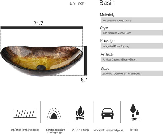 Bathroom Vessel Sink, Boat Shape Bathroom Artistic Glass Vessel Bowl Basin with Free Oil Rubbed Bronze Faucet and Pop-Up Drain, Gold Ingot
